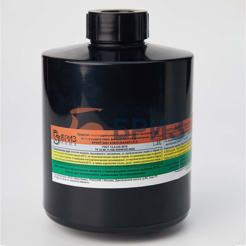 Фильтры комбинированные «БРИЗ®-3001» A3B3E2K2AXP3 R D имеют резьбовое соединение (Кр 40х4 ГОСТ 8762-75) и предназначены для применения в составе различных фильтрующих средств индивидуальной защиты органов дыхания производства ООО «Бриз-Кама» (с маской «БРИЗ®-4301М(ППМ)» категории 2маской «БРИЗ®-4301(ППМ)» категории 3, маской «БРИЗ®-4306(ЭВР)» категории 2 исполнения IIшлем-маской ШМП класс 1 категории 2) для очистки вдыхаемого человеком воздуха от химически опасных и вредных токсичных веществ в том числе аварийно-химически опасных веществ ингаляционного действия (АХОВИД), а также различных аэрозолей, которые могут присутствовать в воздушной среде зоны применения данных фильтров в виде паров, газов и аэрозолей.