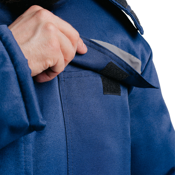 Куртка застёгивается на молнию, закрытую защитной планкой на кнопках, что дополнительно защищает от ветра и холода. Накладные карманы с клапанами расположены в нижней части полочек, все клапаны фиксируются на липучку. Рукава рубашечного покроя дополнены внутренними трикотажными манжетами для сохранения тепла.