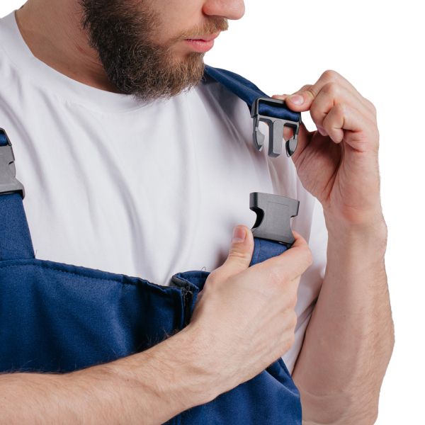 Для защиты коленей предусмотрены наколенники, а также нанесена светоотражающая полоса шириной 2,5 см. Дополнительная застёжка на пуговицах расположена на правой стороне бокового шва, что упрощает надевание изделия.