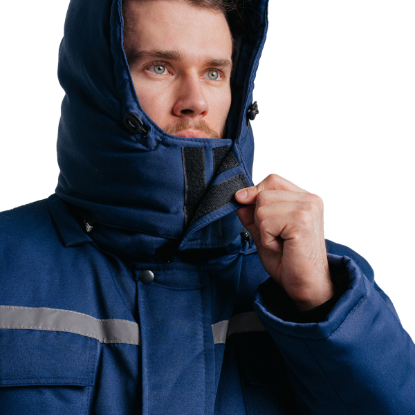 Отложной меховой воротник обеспечивает дополнительную защиту шеи от холода. Отстёгивающийся капюшон, крепящийся на молнию, регулируется и застёгивается спереди на две липучки.