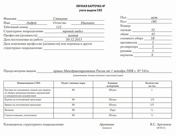 Как оформляется личная карточка СИЗ